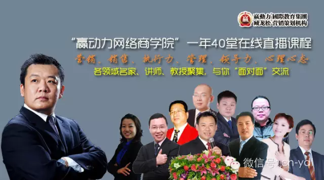 熱烈祝賀《贏動力網(wǎng)絡(luò)商學(xué)院》 “在線直播”100期! 第101期課程預(yù)告: 【臧龍松老師《贏在促銷》】熱烈祝賀《贏動力網(wǎng)絡(luò)商學(xué)院》 “在線直播”100期 第101期課程預(yù)告: 【臧龍松老師《贏在促銷》】 2015年4月15日·對全國各地的贏動力網(wǎng)絡(luò)商學(xué)院的學(xué)員、參與平臺授課的老師和工作人員來說,是一件值得紀念的、值得納入贏動力國際教育集團發(fā)展歷程大事件的日子! 贏動力網(wǎng)絡(luò)商學(xué)院平臺在線直播開班100期了! 自2012年6月開班以來,贏動力網(wǎng)絡(luò)商學(xué)院一直著力于服務(wù)零售企業(yè)的運營與發(fā)展,為中國零售行業(yè)之興盛而努力。平臺的授課師資均為業(yè)界知名專家、講師、企業(yè)家,而學(xué)員多是來自全國各行各業(yè)終端門店從業(yè)者、管理者和投資老板;或是零售型各行業(yè)制造企業(yè)、零售運營體系的相關(guān)從業(yè)者; 贏動力以實體門店運營為核心,延伸出了“可落地、可復(fù)制”的零售課程研發(fā)體系;秉持以“把經(jīng)驗傳遞給有夢想的人”為使命,向中國零售行業(yè)輸送人才為宗旨,創(chuàng)辦在線直播平臺“贏動力網(wǎng)絡(luò)商學(xué)院”。 【贏動力網(wǎng)絡(luò)商學(xué)院】 您快速成長的選擇 贏動力網(wǎng)絡(luò)商學(xué)院是贏動力國際教育集團新開發(fā)的一項網(wǎng)絡(luò)培訓(xùn)平臺,這里有眾多頂級專家在線現(xiàn)場直播授課,在這里學(xué)員將學(xué)習(xí)到營銷策劃、執(zhí)行力、管理學(xué)、銷售技巧、心理心態(tài)等經(jīng)典課程。在這里,學(xué)員能夠?qū)崟r與眾多業(yè)內(nèi)專家面對面互動交流,專家也會實時在線解答學(xué)員所遇到的問題。在這里,學(xué)員不但能收獲更多的專業(yè)知識,而且還能收獲更多的人脈。在這里學(xué)習(xí),您可以節(jié)省更多的時間,你也可以節(jié)省更多的開銷。 【加入贏動力網(wǎng)絡(luò)商學(xué)院的理由】